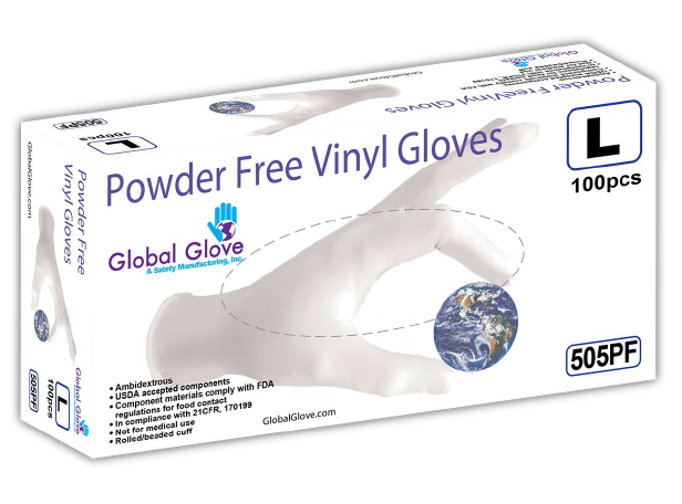 5 milésimas Vinilo Claro sin polvo grado industrial guantes desechables. 100 guantes por dispensador. Cumpliendo con las regulaciones de la FDA para el contacto con alimentos.