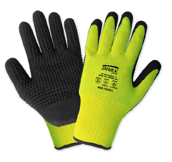 This 10 gauge, aramid sewn glove provides both excellent cut resistance & heat resistance with a performance dip. The highly visible liner is enhanced by an Xtreme Foam Technology dipped palm for superior wet/dry grip, breathability and dexterity. The palm has nitrile dots to provide better grip, wear resistance and short term heat protection.